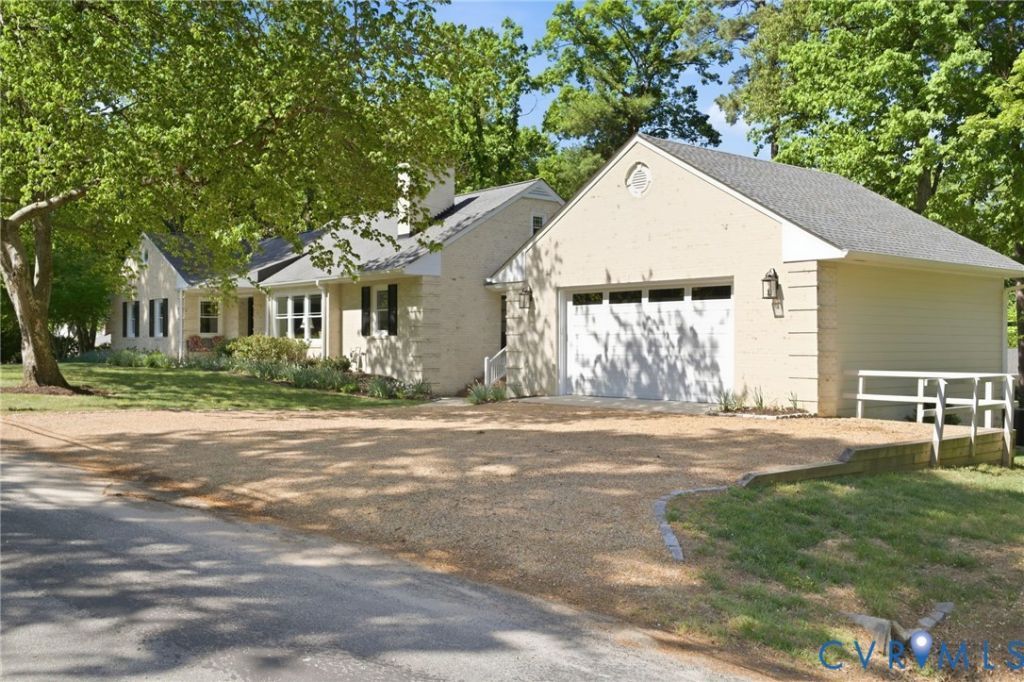 Tucked along the James on a private .53 acre lot, this east-facing mid-century ranch delivers a wonderful combination of natural seclusion and city proximity. The limewashed exterior, new gutters w/ leaf guards, replacement windows, and new 2.5 car garage stand out upon arriving to this beautiful neighborhood. Inside you'll find immaculate hardwood floors throughout leading you to a spacious one level living with 3 bedrooms and 2.5 baths. Between the cozy den and the large open living area, there are ample living and entertaining layouts. The kitchen has been updated with quartz countertops, soft-close overlay cabinetry, and a professional-grade double cavity gas oven with reversible center griddle. Off the kitchen you'll find side door access, storage and a cute half bath. The finished sunroom with new windows, doors and siding overlook the large back yard and lead onto the new deck. You'll love the sunsets from the sunroom! 3 King-sized bedrooms with large closets offer generous comfort, while 2 full baths on the first floor service said bedrooms. The crown jewel is a sprawling 800 sqft finished basement - a true extension of the home's living space. Gather around the wet bar with granite countertops and beverage fridge, retreat to the private full bathroom and dressing area (could be a bedroom), or create in the unfinished workshop side. Walk-out access, a new mini-split system, and full waterproofing make this lower level as functional as it is inviting. Attached outside shed adds additional options for expansion. New exterior shed is perfect for lawn equipment. Beyond the walls, mature hardwoods frame open lawn and established landscaping in a setting that feels effortlessly park-like. This property offers increasingly rare one floor living in Richmond City with walkability to the James River