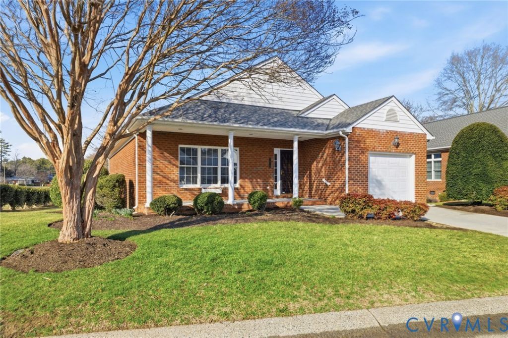 Welcome to easy, low-maintenance living in the desirable Braxton 55+ Community! This well-maintained one-level brick home offers 2 bedrooms, 2 bathrooms, and 1,694 sq ft of comfortable living space and is ideally located at the front of the neighborhood with quick access to the lake and clubhouse. The home also enjoys a rare setting with only one neighboring property, providing added privacy. A covered front porch with decorative brick accents and transom windows welcomes you inside to a foyer with tile flooring that opens to a spacious great room featuring hardwood floors, recessed lighting, and a gas fireplace with wood mantel. The dining area is filled with natural light from four windows with transoms and custom wood blinds. The kitchen offers tall wood cabinetry, laminate countertops, tile backsplash, double stainless sink, off-white appliances, recessed lighting, and two large windows overlooking the backyard. Just off the kitchen is access to the rear entrance and patio, perfect for relaxing while enjoying the maintained landscaping, along with a laundry closet with side-by-side hookups, overhead cabinets, and a pantry. The home features two bedrooms including a primary suite with walk-in closet and private bath with tile flooring, Corian vanity, walk-in shower with bench, and linen storage, while the secondary bedroom overlooks the front yard and includes large windows with shutters and ample closet space. Additional highlights include 9 ft ceilings, multiple storage closets, a stand-up pull down floored attic with extra insulation, and a single-car garage with above built-in shelving, pedestrian door, and pull-down attic access. Major updates include a 2020 30-year dimensional roof and a 12KW Kohler whole-home generator connected to the municipal gas line for dependable backup power. Braxton residents enjoy a low-maintenance lifestyle with clubhouse access, stocked pond for residents only fishing, walking gardens community areas, snow removal, trash service, and yard maintenance included.